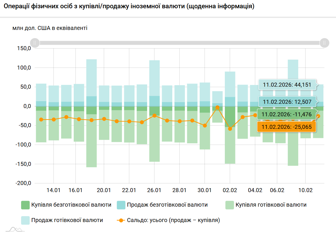 В целом с 9 по 13 февраля разница между ежедневными объемами превышения покупаемой валюты населением и объемами ее сдачи не превышала $22 млн — 40 млн. Это не критичные суммы для рынка, который в пиковые дни предыдущих ажиотажей 2022−2024 годов иногда «переваривал» превышение и до $100 млн.