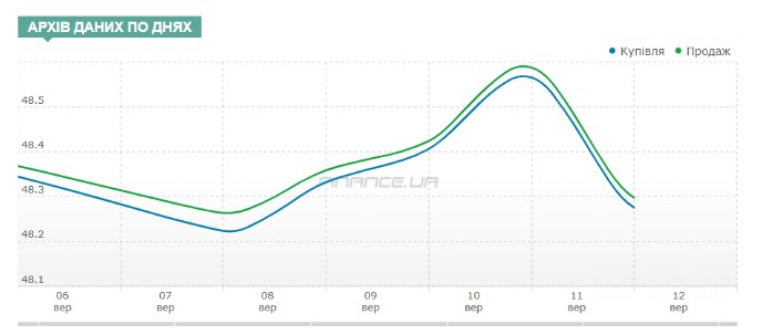 Курс продажи евро на межбанке за этот же период даже просел почти на 2 копейки — с 48,2959/48,3228 до 48,2857/48,3085 грн. Наличный курс евровалюты реагировал на все изменения межбанка, но при этом без собственных попыток «разогреть» рынок. Поэтому вечером в пятницу наличный евро в обменниках без проблем продавался по 48,6−48,75 гривен.