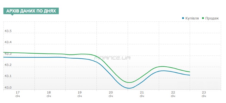 В результате, за период с 19 по 23 января 2026 года, несмотря на нервозность на мировых рынках и сохранение девальвационных настроений среди участников украинского межбанка, курс продажи доллара США на торгах снизился на 20,5 копеек со стартовых котировок понедельника 43,31/43,36 до 43,125/43,155 гривен к концу пятничной сессии. А на наличном рынке вечером 23 января доллар продавался по 43,55 — 43,65 грн.