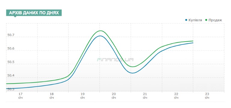 А вот курс безналичного евро за эту неделю вырос почти на 28 копеек — со стартовых уровней понедельника 50,3651/50,4060 гривен до 50,6589/50,6855 гривен к вечеру 23-го января. В этом заслуга больше внешних факторов, так как на всех геополитических «стрессах» Давоса евро прилично подорожал относительно доллара, что приводило к автоматическому росту котировок евровалюты относительно гривны через пересчет пар евро/доллар и доллар/гривна. При этом на украинском наличном рынке вечером в пятницу евровалюту в обменниках продавали по 50,95−51,15 грн.