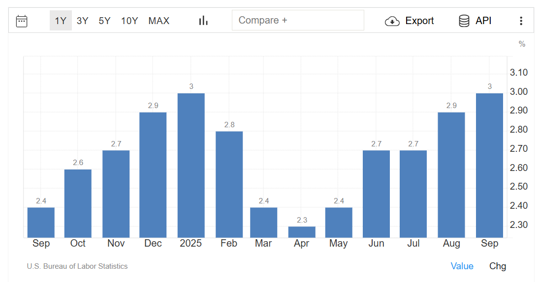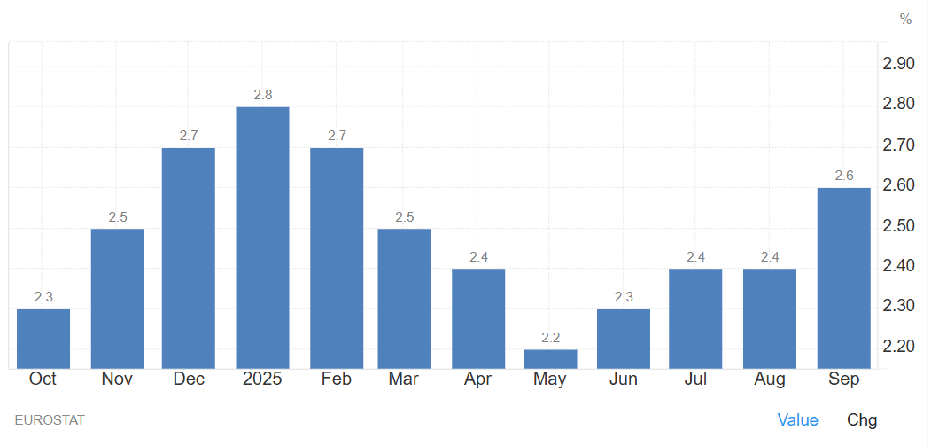 Уровень годовой инфляции в ЕС вырос до 2,6% в сентябре, по сравнению с 2,4% в августе 2025 года. Но это ниже, по сравнению с динамикой потребительских цен в США. К тому же инфляция еще может резко ускориться из за-действия новых, более высоких пошлин на импорт, которые хаотично вводит Трамп.