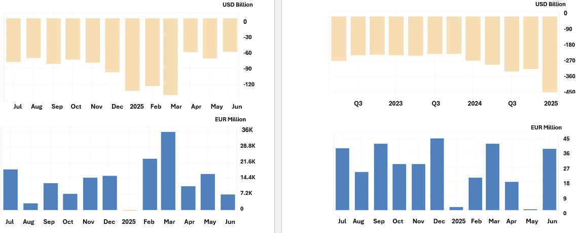 На графике ниже представлены данные о динамике торгового дефицита (справа) и текущего счета (слева) в еврозоне и США.