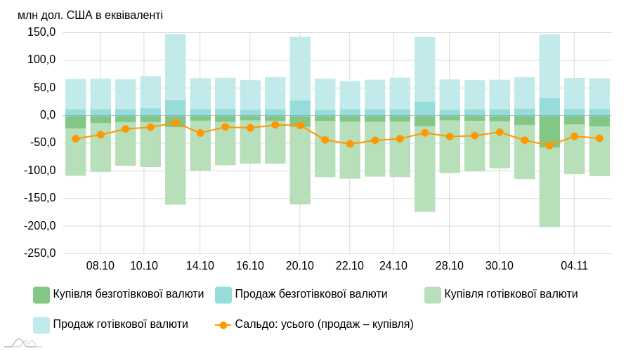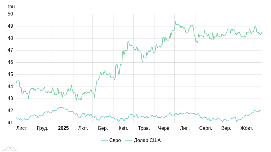 Из позитивного для гривны стоит выделить рекордный рост золотовалютных резервов Украины: на 1 ноября они выросли на 6,4% и достигли $49,516 млрд, что является самым высоким показателем за всю историю независимой Украины. Эта динамика обусловлена значительными объемами поступлений от международных партнеров в октябре, которые превысили чистую продажу валюты Национальным банком и долговые выплаты государства в инвалюте. Как подчеркнул НБУ в своем пресс-релизе, «объем международных резервов достаточен для сохранения устойчивости валютного рынка».