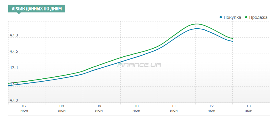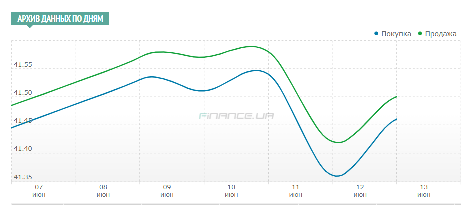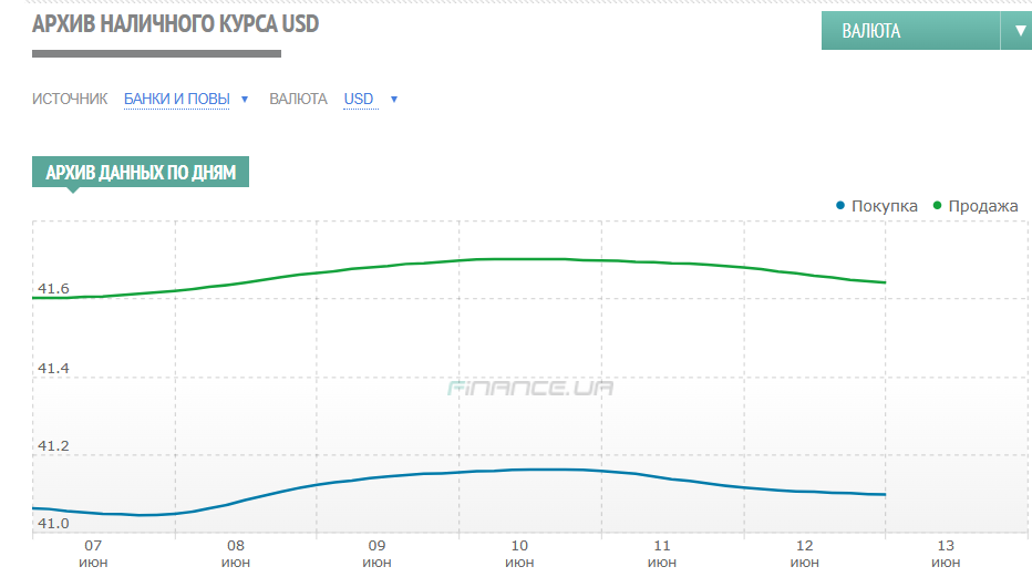 В целом с 9 по 13 июня курс продажи доллара на межбанке вырос всего на 6 копеек — с 41,40/41,44 до 41,46/ 41,50 гривен, а наличный доллар вечером в пятницу, 13 июня, обменники финкомпаний продавали по 41,45 — 41,65 гривен.