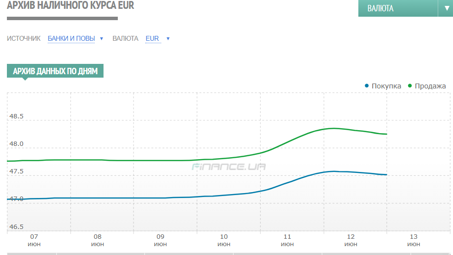 А вот курс продажи евро за этот же период на межбанке взлетел сразу на 48 копеек — со стартовых уровней 9 июня 47,3160/47,3452 до 47,7950/47,8246 гривен к завершению сессии 13-го числа. Наличный евро в обменниках финкомпаний вечером пятницы продавался в пределах 48,10 — 48,25 гривен. Причем основная заслуга в таком укреплении позиций евро относительно гривны принадлежит именно концу недели, когда на фоне израильских налетов на иранские атомные и военные объекты евровалюта пробивала на мировых площадках даже уровень в 1,16 доллара за евро и это немедленно отражалось на курсе евро в Украине.