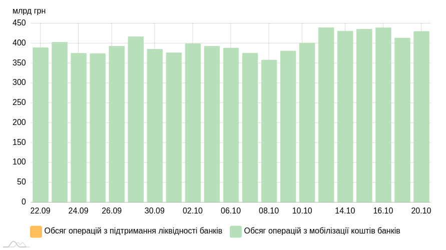 Частично потребность в деньгах Минфин может удовлетворить за счет покупки ОВГЗ банками. По состоянию на 21 октября в их портфеле находилось бумаг на 901,79 млрд гривен в эквиваленте. По моим подсчетам, Минфин сможет рассчитывать до конца года на дополнительное привлечение 30−50 млрд грн максимум. Частично — за счет переброски средств банков с депозитных сертификатов НБУ, где объемы вложений финучреждений ежедневно колеблются в пределах 400−440 млрд грн.