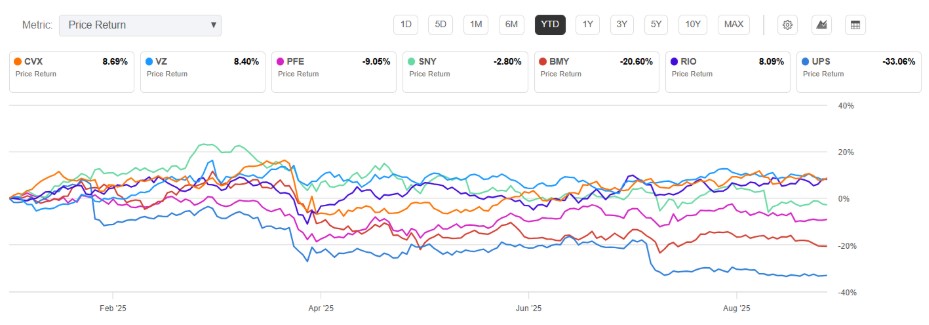 Стабильный дивидендный фундамент: Verizon и Chevron формируют «облигационное ядро» портфеля с прогнозируемыми выплатами на уровне 4−6%, что снижает общую волатильность.
