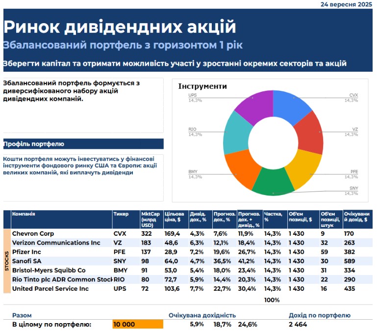 На горизонте 1 года портфель предлагает прогнозируемую среднюю дивидендную доходность 5,9% и потенциал роста акций на 18,7%, что в совокупности формирует общую доходность 24,6%.