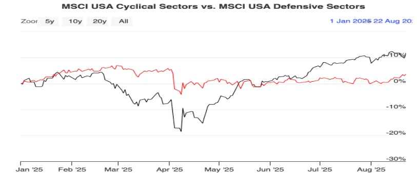 Сравнение динамики доходности компаний защитных секторов с циклическими 01.01.-22.08. 2025 г.
