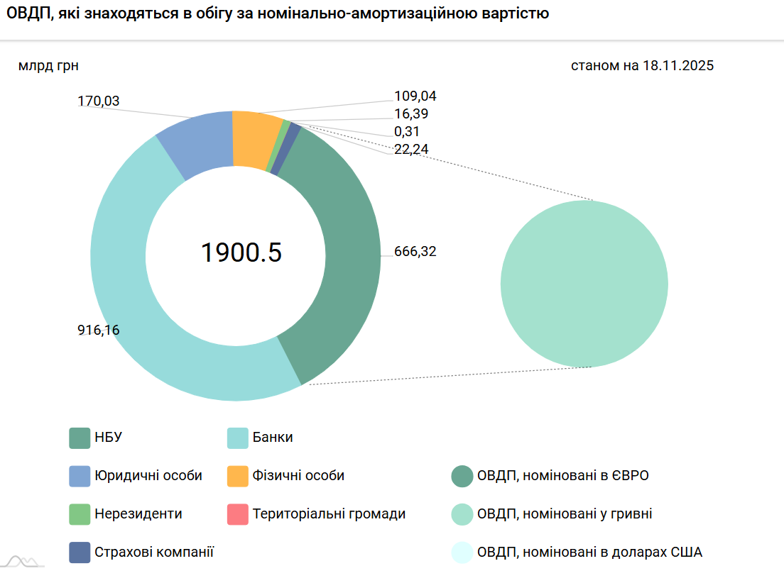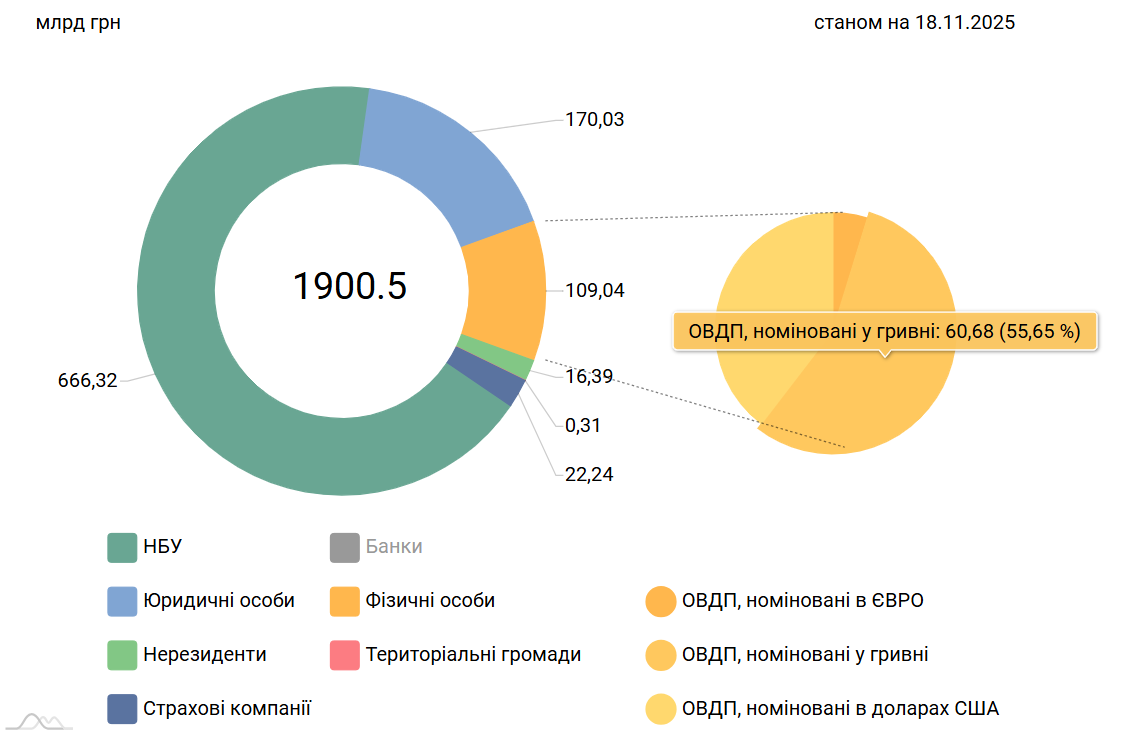 В гривневых бумагах размещено около 60,68 млрд гривен, или 55,65% вложений населения в ОВГЗ, еще порядка 48,36 млрд гривен, или 44,35%, — в валютных. То есть структура вложений тут приближается к уровню 50/50.