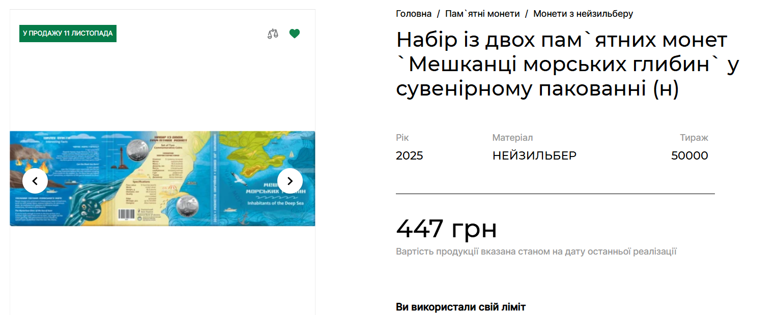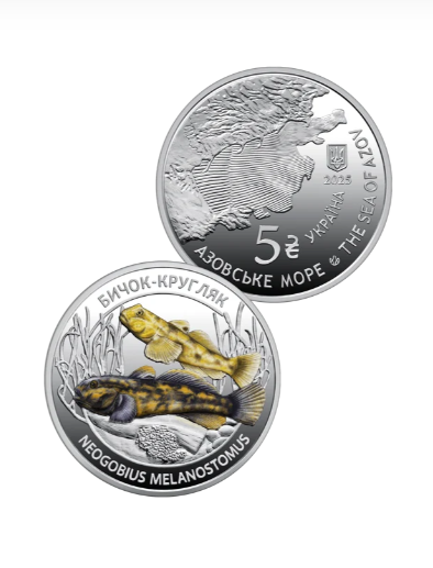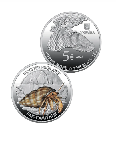 Набор из двух памятных монет «Жители морских глубин», выпущенный 23.10.2025, нейзильбер, тираж 50 000 штук. Набор посвящен уникальным представителям морской фауны Черного и Азовского морей — неотъемлемой составляющей природного наследия Украины. В наборе были представлены две монеты, номиналом по 5 гривен каждая, — рак-отшельник (Diogenes pugilator) и бычок-кругляк (Neogobius melanostomus). Набор предлагался в сувенирной упаковке в количестве 25 000 штук по цене 447 гривен за набор.