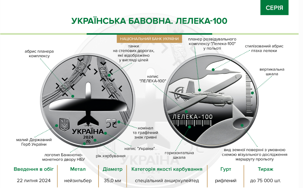 Монета «Українська бавовна. Лелека — 100», выпущенная 22.07.2024, нейзильбер, тираж до 75 000 штук, номинал 5 гривен, посвящена многоцелевому беспилотному авиационному комплексу «Лелека-100» — надежному защитнику украинского неба. К реализации предлагалось 18 750 штук по цене 121 гривна за штуку.