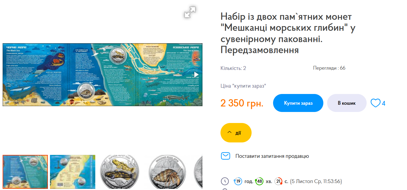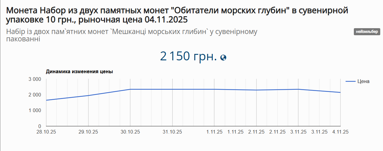 Несмотря на достаточно большой тираж (50 тысяч штук) и анонсированную Национальным банком 11 ноября новую продажу данного набора, «Жители морских глубин» уже являются «хитом» среди нумизматов. Вот «проходы» (т.е. это реальные покупки этих монет на рынке) этого набора на специализированных аукционных площадках Украины за последние дни.