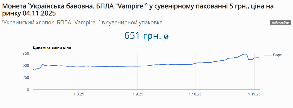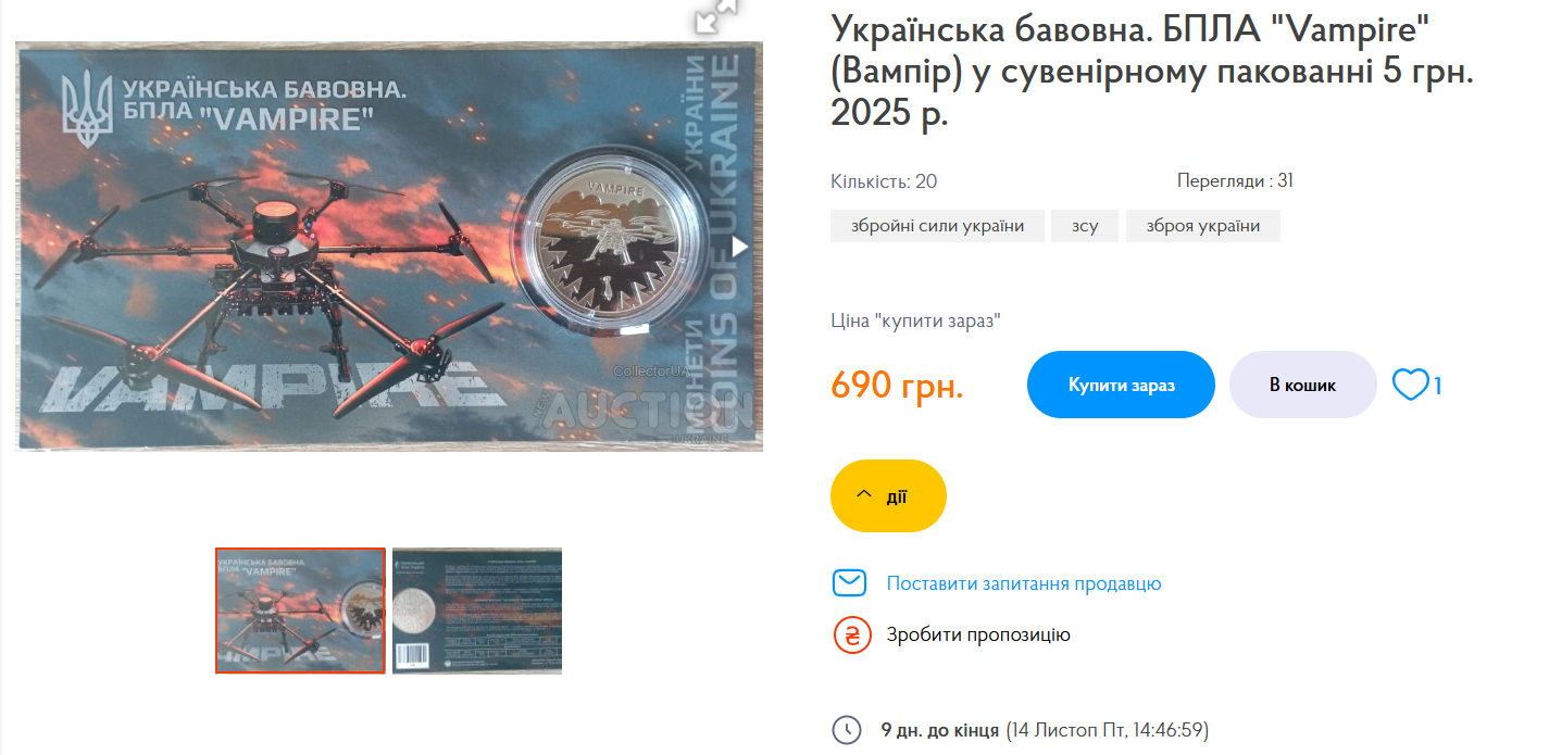 Похожая ситуация и с последней из монет «Українська бавовна. БПЛА «Vampire», которые 28 октября продавались в интернет-магазине Нацбанка.