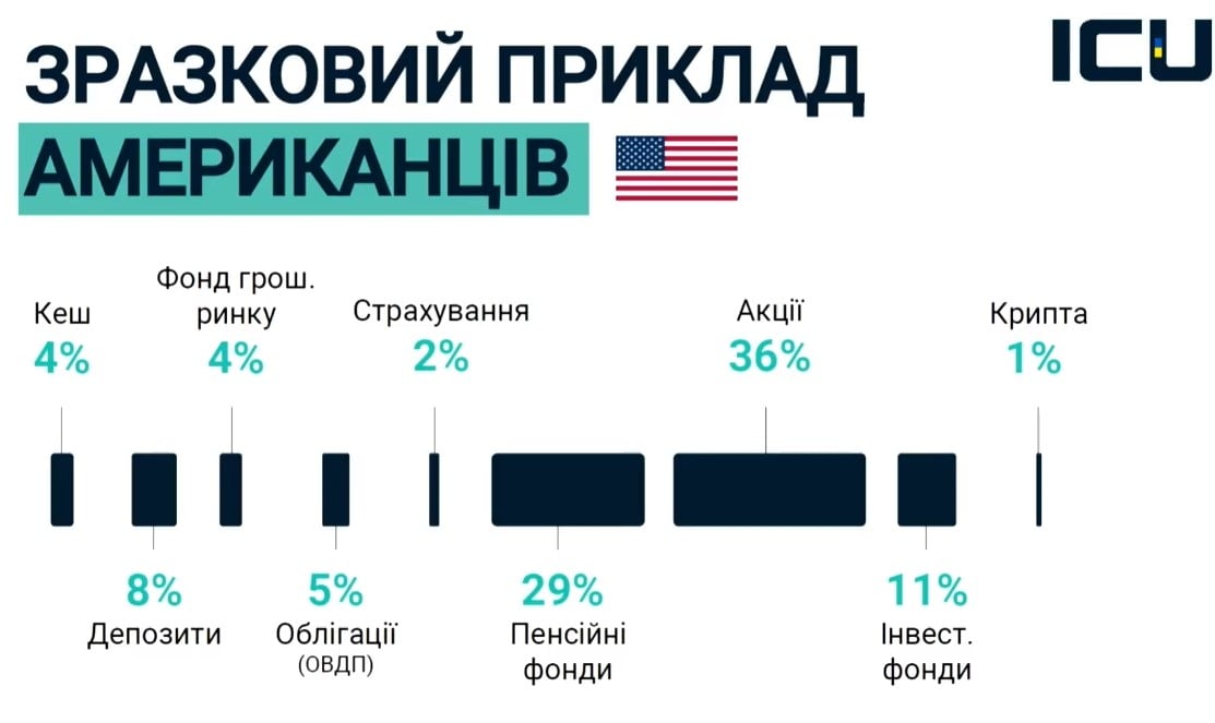 Для того, чтобы лучше всего понять, во что инвестируют украинцы, он предлагает взглянуть на структуру финансовых активов и сравнить ее с американской.