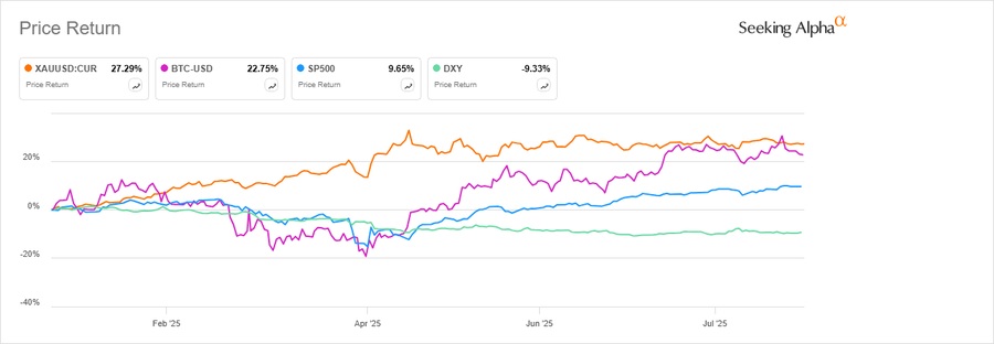 По подсчетам аналитиков UBS, с начала 2025 года спотовые цены на золото поднялись более, чем на 27%, опередив по доходности все остальные классы активов, включая ключевые фондовые и долговые индексы, ведущие валюты и даже биткоин.