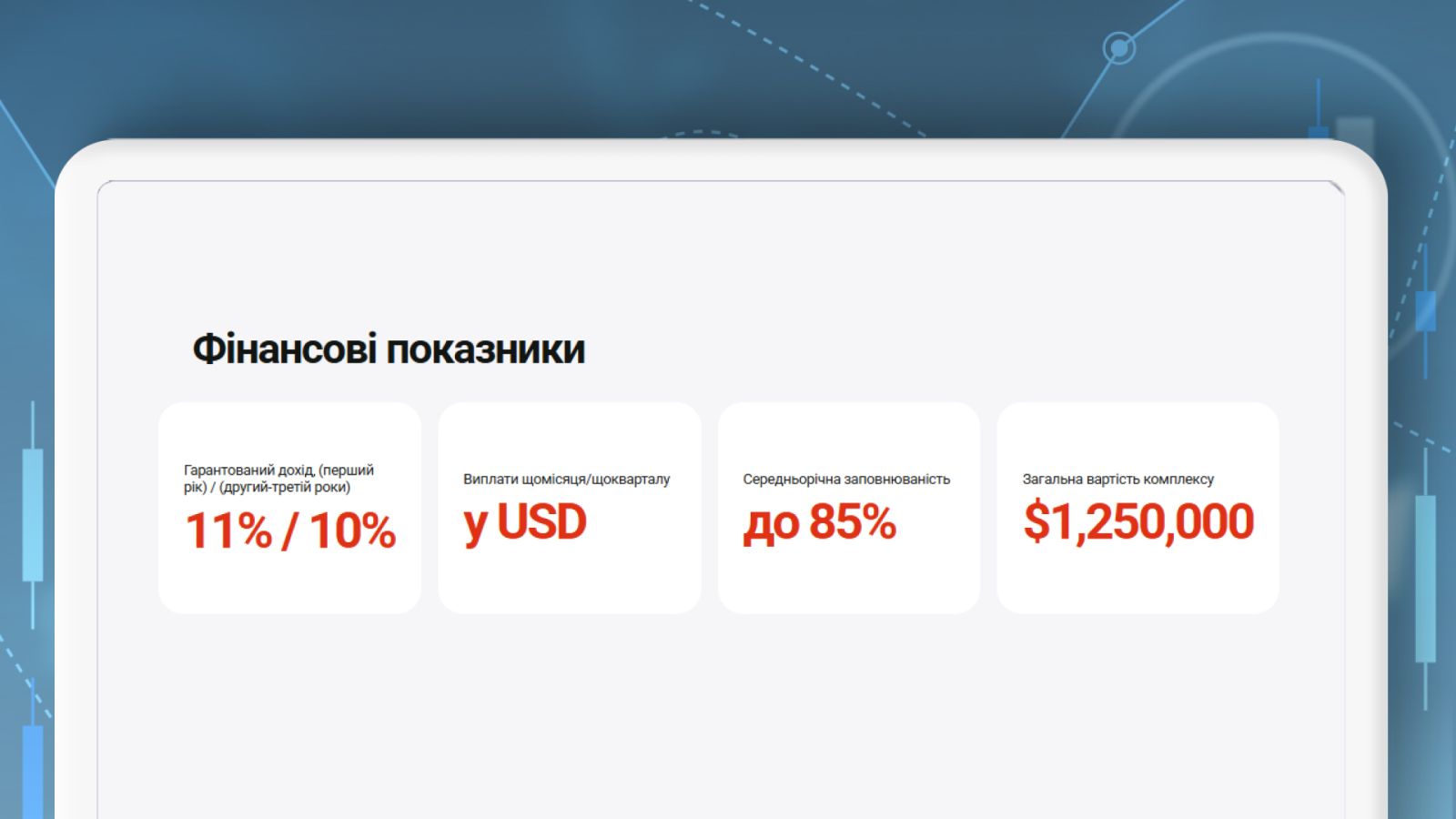 Общая стоимость комплекса составляет $1,250,000. Инвесторы получат гарантированный доход на уровне 11% (первый год) и 10% (второй-третий года).