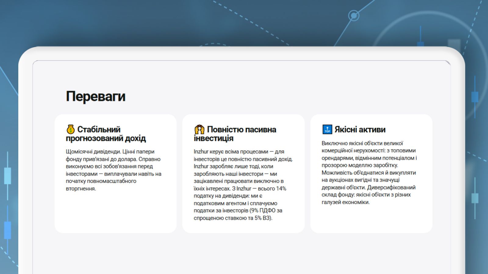 Дивиденды инвесторам выплачиваются ежемесячно, в соответствии с количеством купленных сертификатов. А сама инвестиция является полностью пассивной. Дополнительно вкладчики зарабатывают на росте стоимости объектов — общий доход от капитализации вкладчиков фонда составляет уже 328 млн грн. Всего фонд объединяет более 11 тыс. совладельцев, которые владеют активами на сумму почти 3 млрд грн.