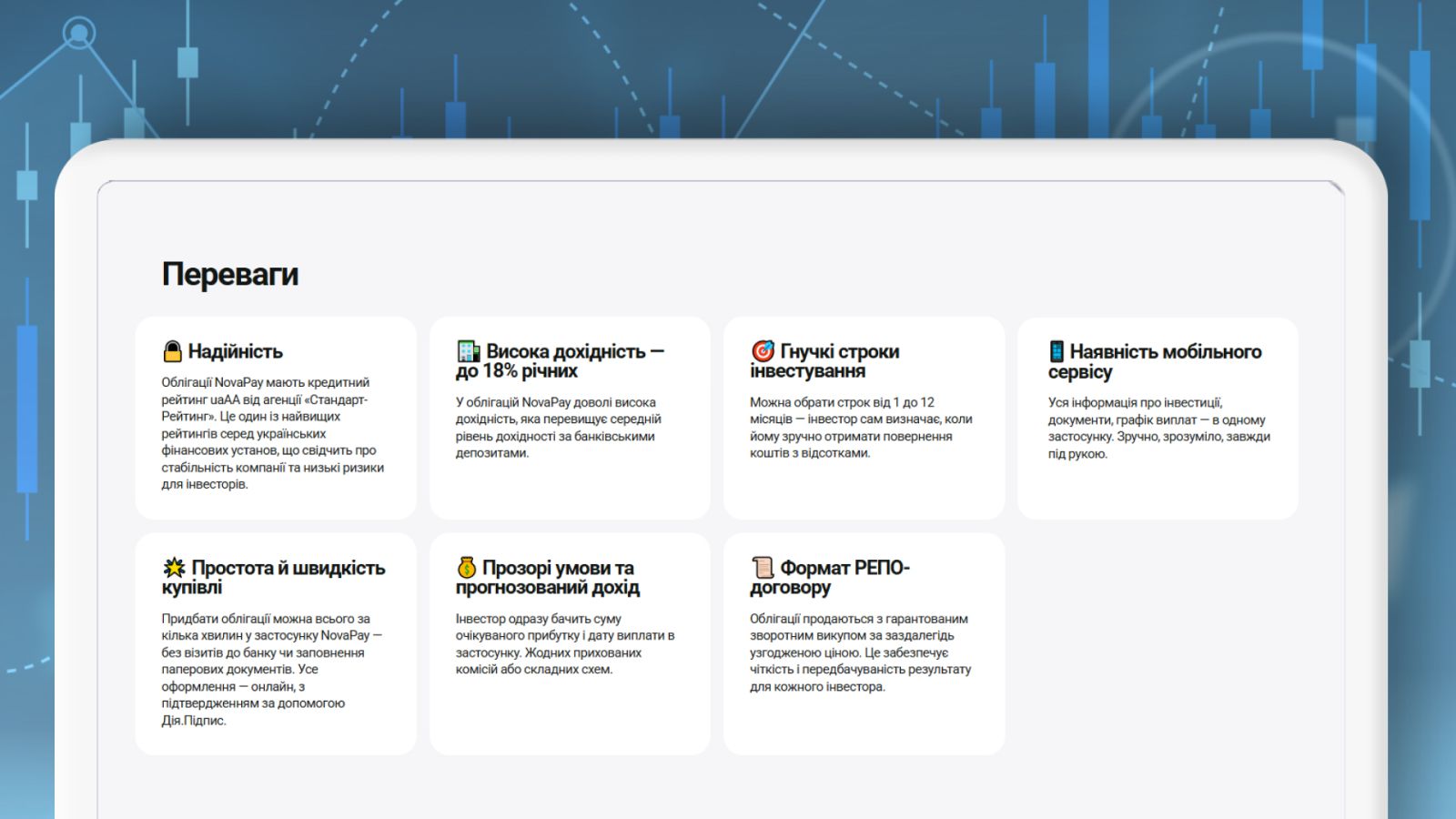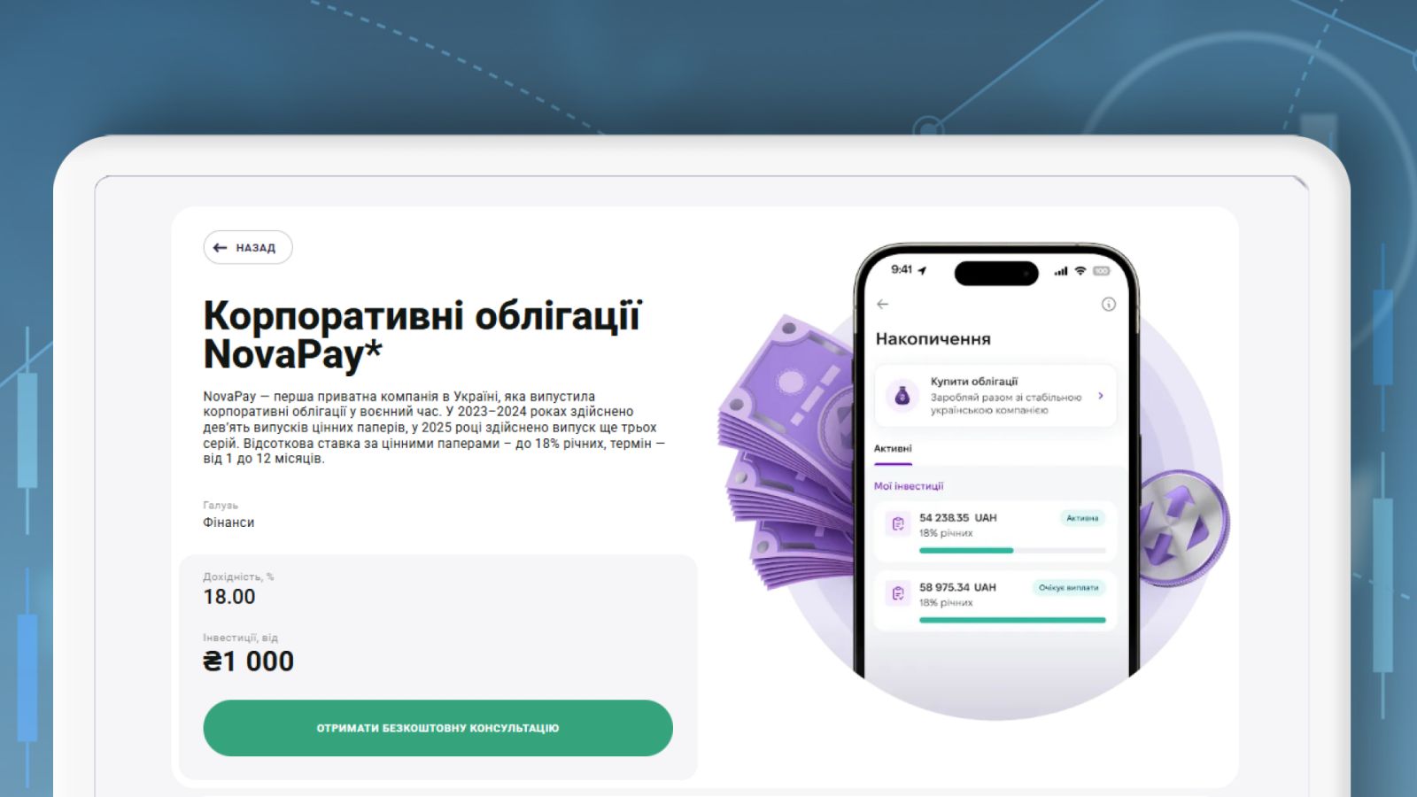 Порог входа в инвестицию составляет от 1 тыс. грн. При этом доходность облигаций NovaPay превышает средний уровень доходности по банковским депозитам и составляет до 18%.