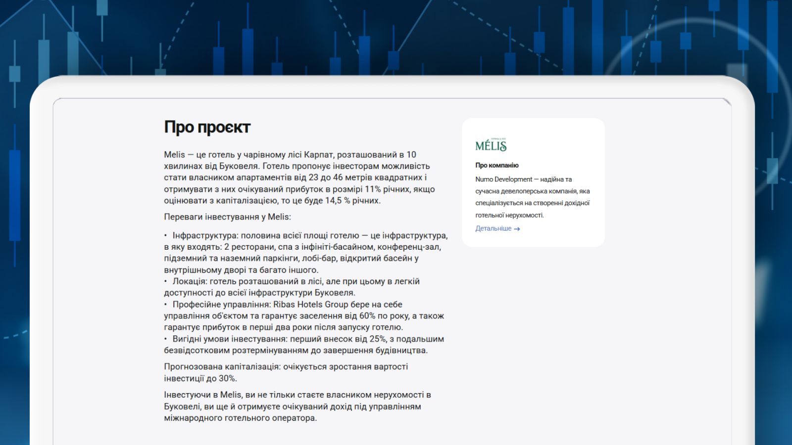 Или же отель Melis возле Буковеля, где инвесторы могут купить апартаменты от 23 до 46 квадратных метров. Прогнозируемая прибыль по этому объекту — 11% годовых.