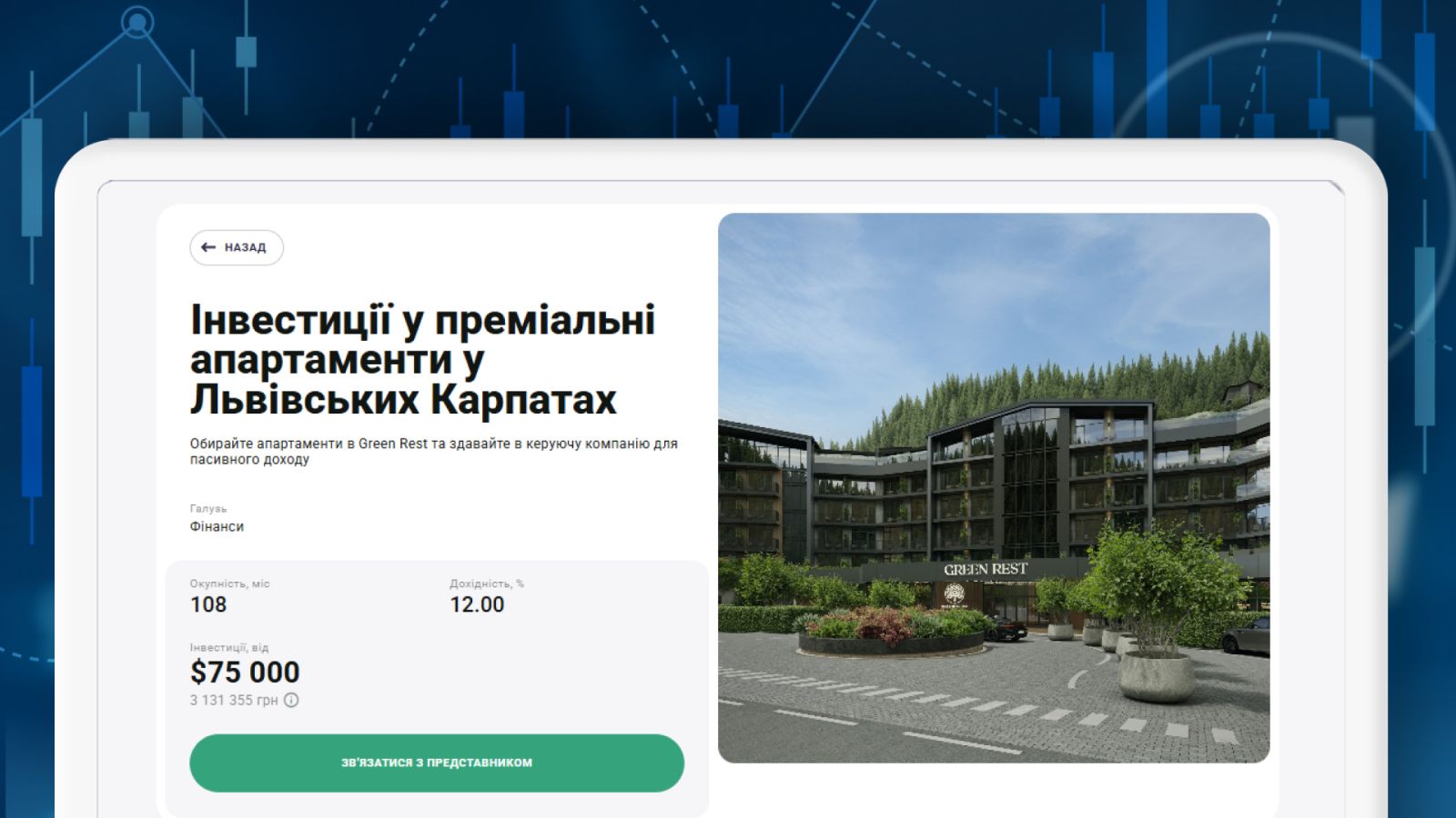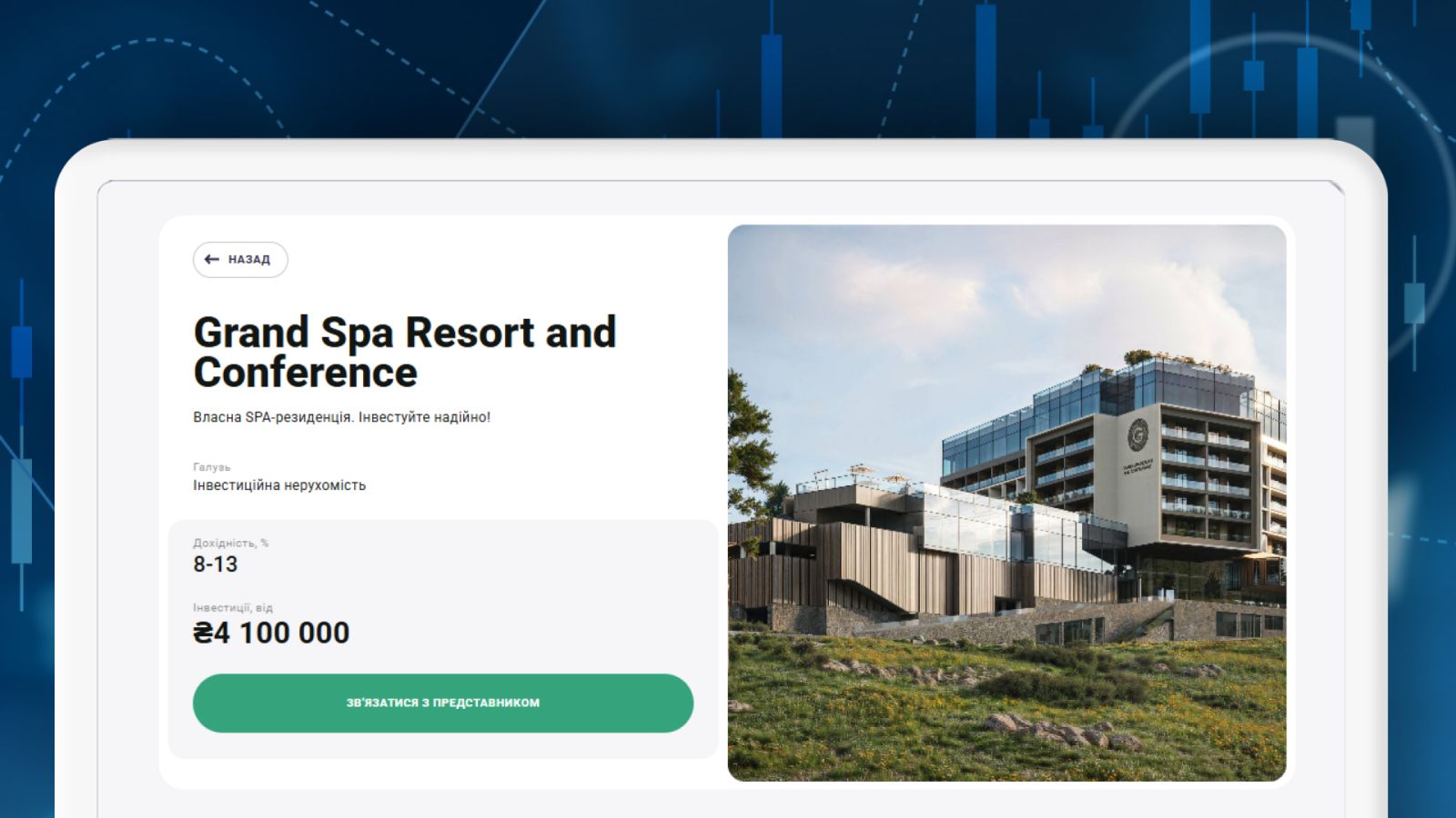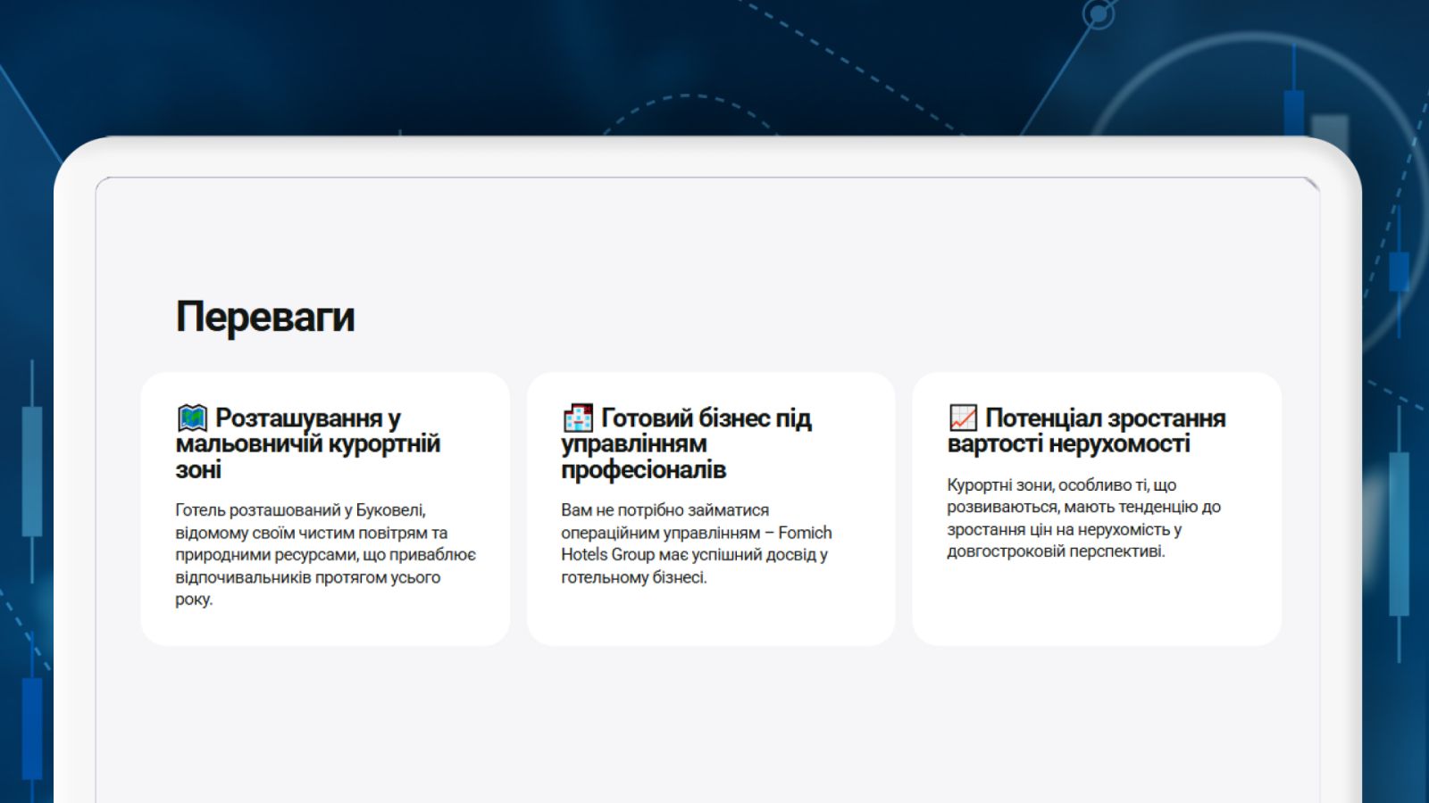 Например, на InvestMarket представлен инвестиционный проект Grand Spa Resort and Conference от Fomich Hotels Group. Это отель, расположенный рядом с курортом Буковель. В компании отмечают, что инвестиции в недвижимость в курортных зонах являются перспективными и со временем будут существенно расти в цене. Fomich Hotels Group выделяет это, как одно из преимуществ инвестирования в свой объект.