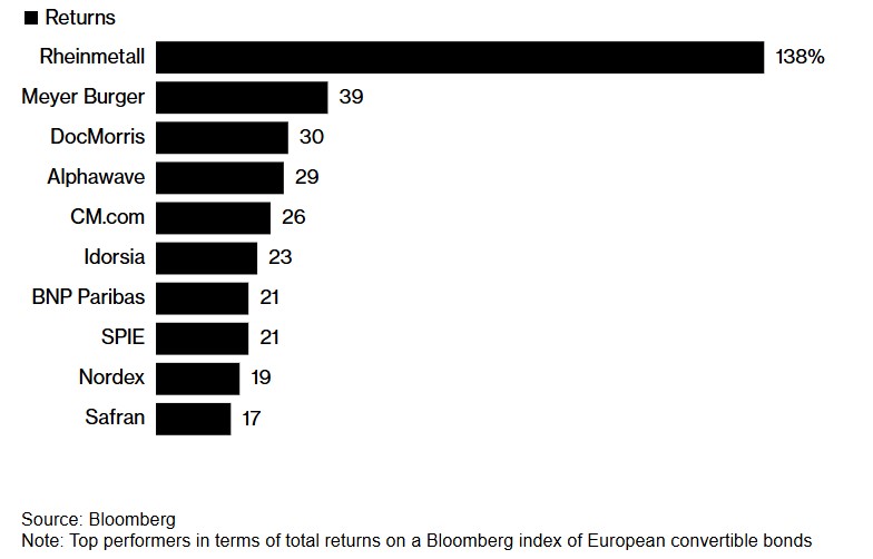 Региональный индекс, отслеживающий долговые ценные бумаги, которые можно конвертировать в акции, в этом году принес более 9% прибыли, отчасти благодаря инструментам, выпущенным игроками оборонного сектора, такими как Rheinmetall AG и Safran SA. Это контрастирует с ключевыми мировыми ориентирами для акций и облигаций, многие из которых либо несут убытки, либо почти потеряли свои прибыли в 2025 году.