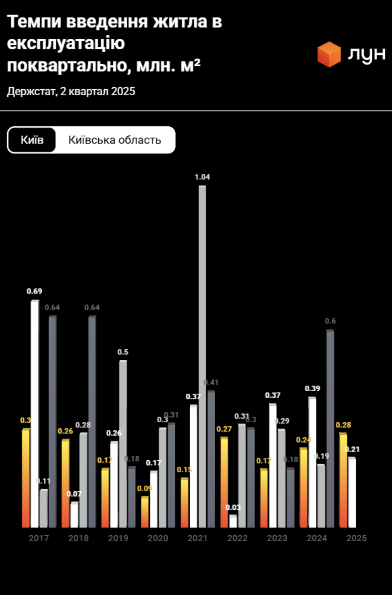 В Киеве по итогам первого полугодия тоже сократились объемы сданного жилья. В этом году застройщики ввели в эксплуатацию 0,49 млн кв.м новостроек, что на 22% меньше, чем за тот же период в прошлом году (0,63 млн кв.м). Если считать в квартирах, то в 2025 году за первое полугодие в столице появилось 7 380 единиц жилья, а в 2024 году за тот же период — 9 360.