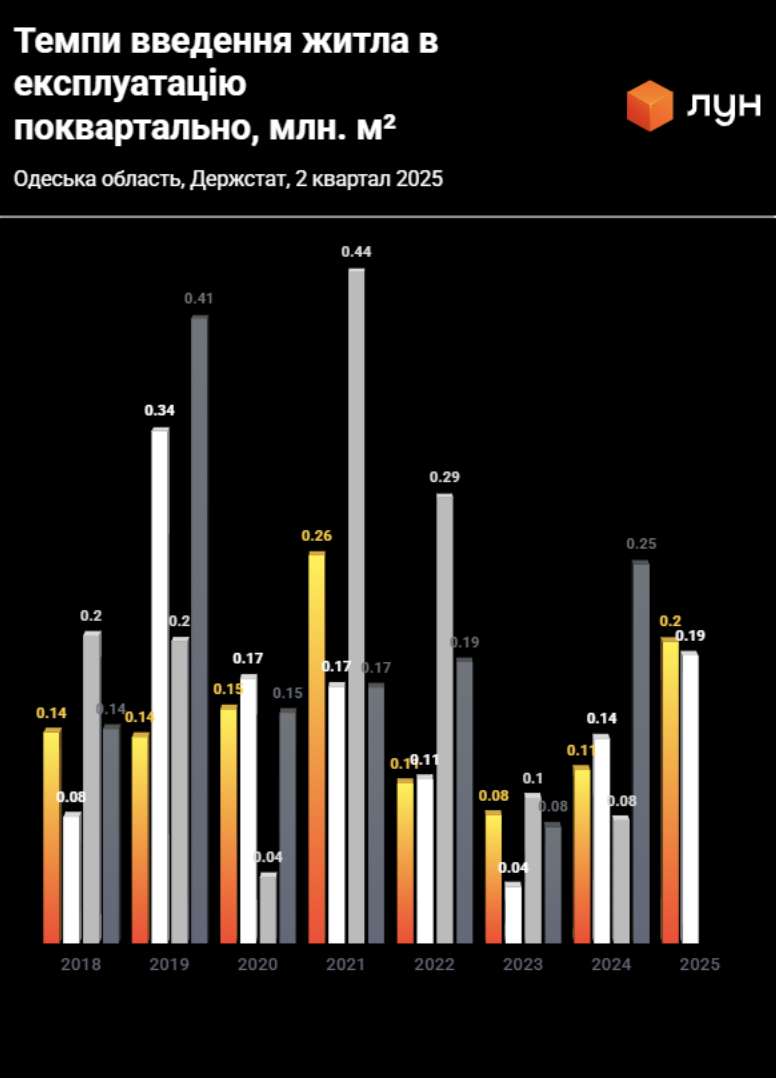 Однако следует отметить, что уменьшение общего объема завершения строительства не означает, что строить стали меньше по всей стране. В частности, в Одесской области в 2025 году построили 0,39 млн кв.м жилья (+56% по сравнению с таким же периодом в прошлом году, 0,25 млн кв.м).