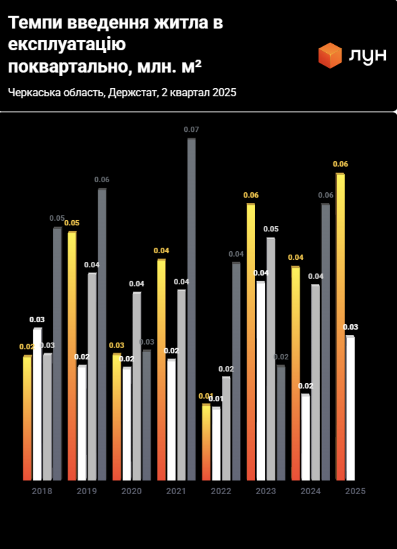 Также существенный рост объемов нового жилья Госстат зафиксировал в Черкасской области (51,6% год к году). В 2025 году за первые полгода в области сдали 0,09 млн кв.м жилья, тогда как в 2024 — лишь 0,06 млн кв.м. В количестве квартир это: 2025 год — 1126 шт., из которых 776 в домах с двумя и более квартир, 2024 год — 760 шт. в целом (данные по распределению квартир по типу домов за этот период не приводятся).