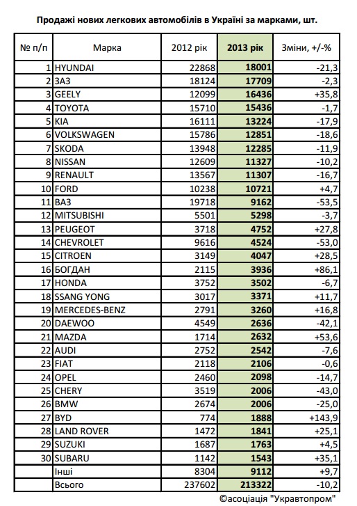 В целом, по оценке «Укравтопрома», в 2013 г. было продано 213,3 тыс. автомобилей, тогда как годом ранее этот показатель составлял 237, 6 тыс.