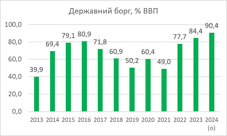 За підсумками 2024 року співвідношення державного боргу до ВВП складе близько 90,4% ВВП (проти 84,4% у 2023 році, 77,7% у 2022 і 49% у 2021 році).
