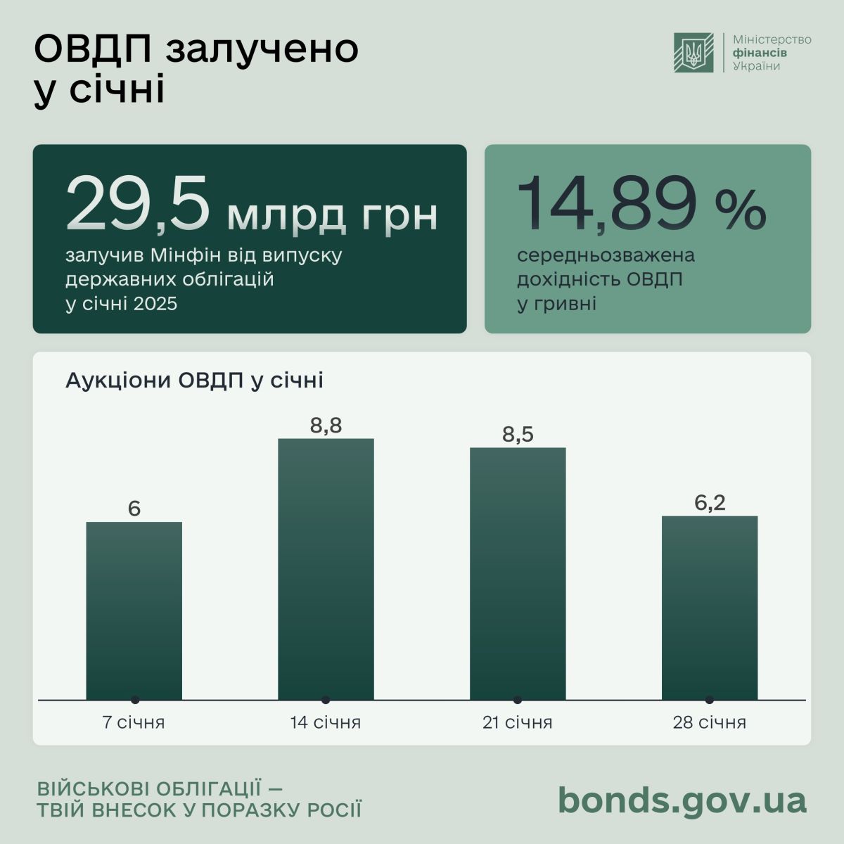 Міністерство фінансів у січні 2025 року залучило до державного бюджету 29,5 млрд грн від розміщення облігацій внутрішньої державної позики (ОВДП). Про це повідомляє пресслужба міністерства.