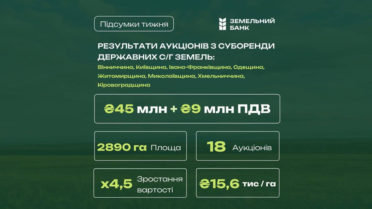 Середня вартість суборенди одного гектара за підсумками торгів склала 15 582 грн, а ціни на земельні ділянки в середньому зросли у 4,5 раза.