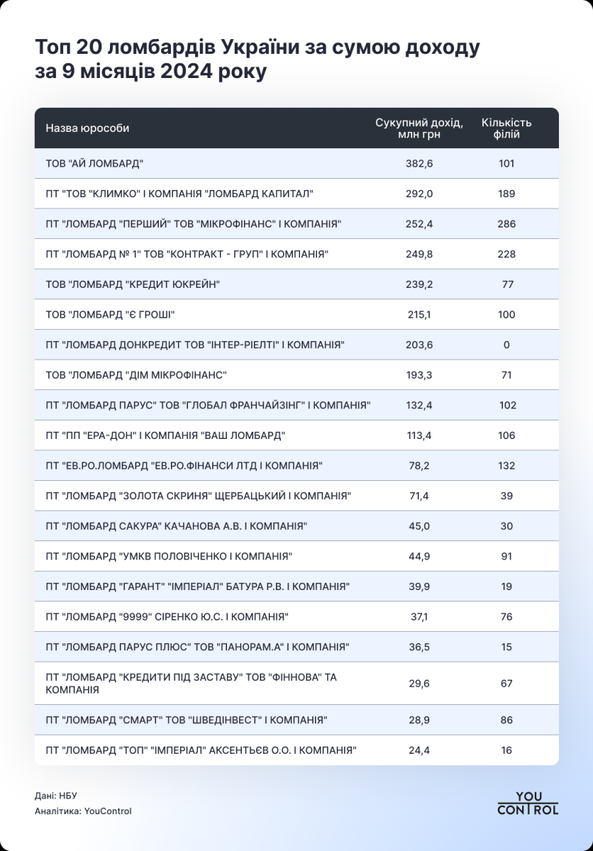 Понад 3 млрд грн доходу за 9 місяців 2024 року отримав 101 ломбард, що подав звітність до національного регулятора. Аналітики R&D центру YouControl проаналізували ринок ломбардів в Україні, використовуючи дані НБУ. Фахівці з’ясували, що попри зменшення кількості розмір їхніх активів суттєво не змінився.