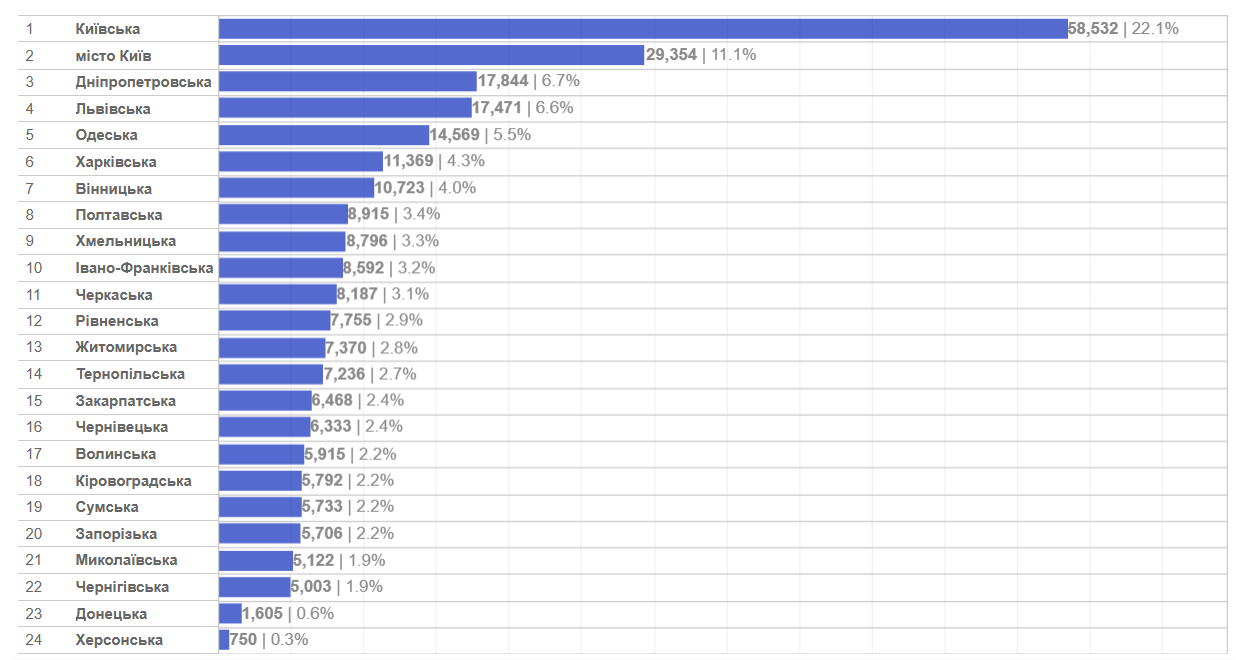 Лідером за кількістю перших реєстрацій стала Львівська область, далі йдуть Київ та Київська область. Найнижчі показники зафіксовані у Донецькій і Херсонській областях.