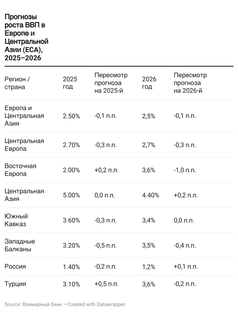 Південний Кавказ покаже зростання на рівні 3,6% у 2025 та 3,4% у 2026 роках. У Вірменії прогноз знижений до 4%, в Азербайджані — до 2,6%, у Грузії — до 5,5%. Уповільнення пояснюється стабілізацією внутрішнього попиту, торгівлі та обсягів грошових переказів у Вірменії та Грузії, а також зниженням нафтовидобутку в Азербайджані.