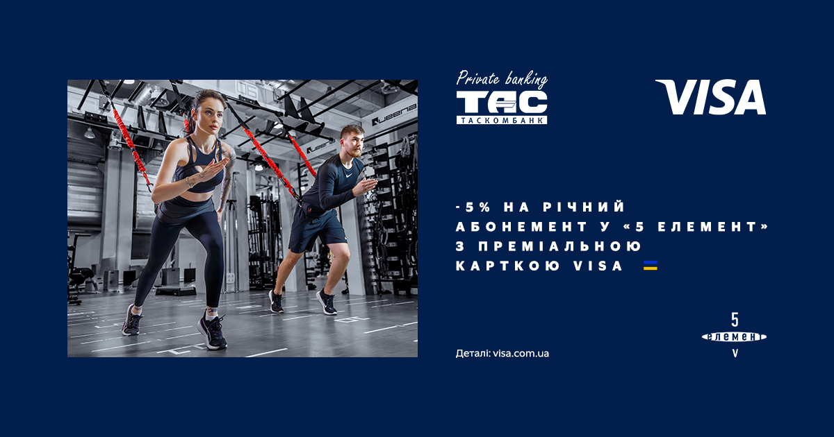 -5% на річний абонемент у «5 елемент» з преміальною карткою Visa від Таскомбанку