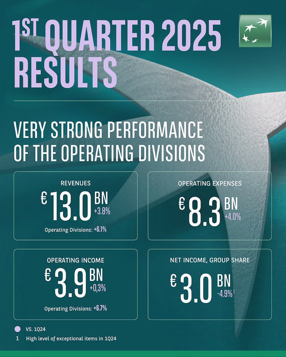 BNP Paribas досягла дуже хороших операційних результатів у першому кварталі 2025 року завдяки відданості своїх команд та ефективності своїх платформ. Група підтверджує свою траєкторію розвитку на 2024−2026 роки завдяки міцності своєї диверсифікованої моделі та стійкості в умовах економічних циклів.