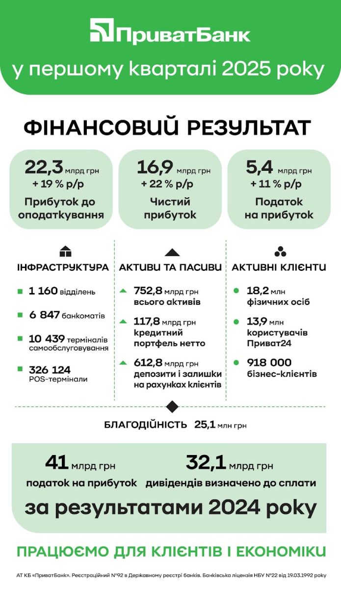 У І кварталі 2025 року бізнес результат Приватбанку без переоцінок, резервів та податків зріс на 10% у порівнянні з аналогічним періодом 2024 року та склав 20,3 млрд грн. Основним драйвером зростання стали результати основної діяльності банку — чисті процентні та комісійні доходи зросли на 13% рік до року. Чистий прибуток становив 16,9 млрд грн.