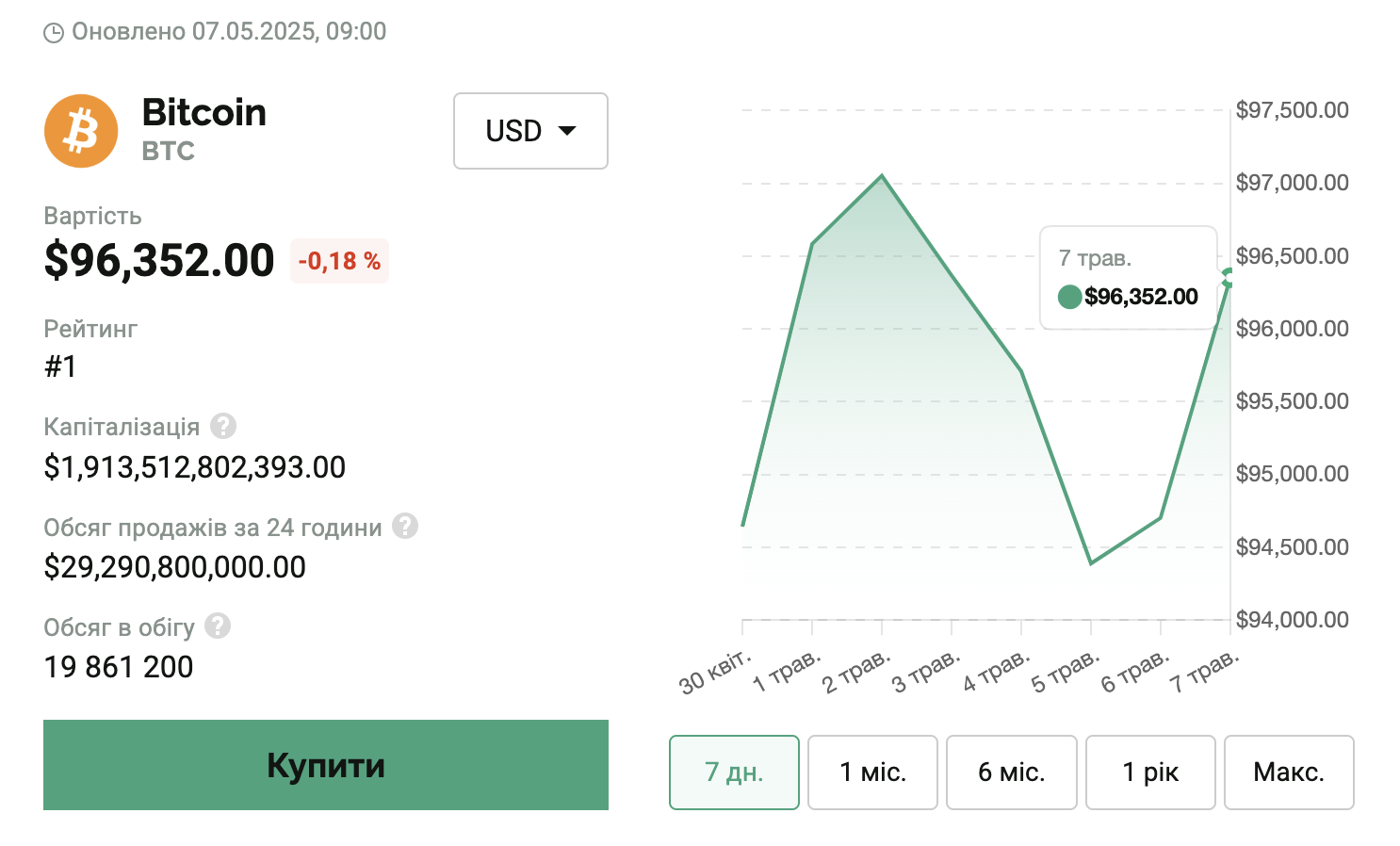 Згідно із даними «Мінфіну», станом на 09:00 вартість першої криптовалюти становить $96, 352.
