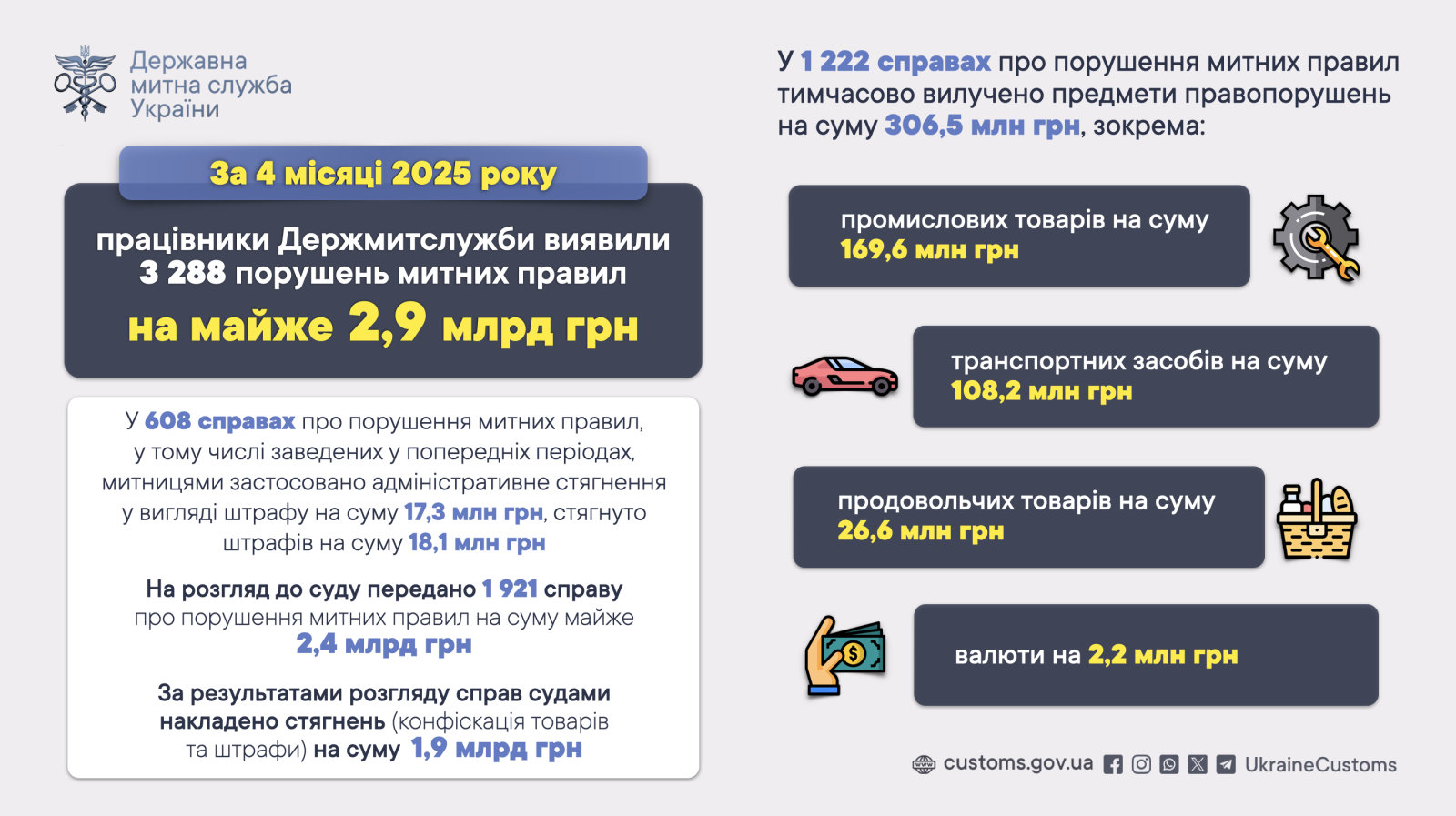 Протягом січня-квітня 2025 року митні органи виявили 3 288 порушень митних правил на майже 2,9 млрд грн. Про це йдеться у повідомленні Митниці.