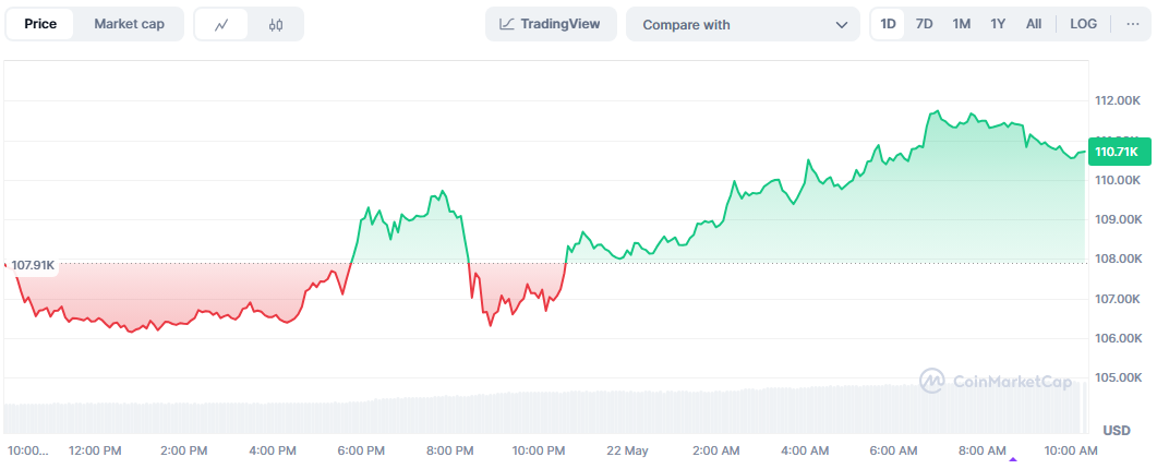 У четвер, 22 травня, вранці перша криптовалюта встановила новий історичний максимум, перевищивши позначку в $111 000. Про це свідчать дані CoinMarketCap.