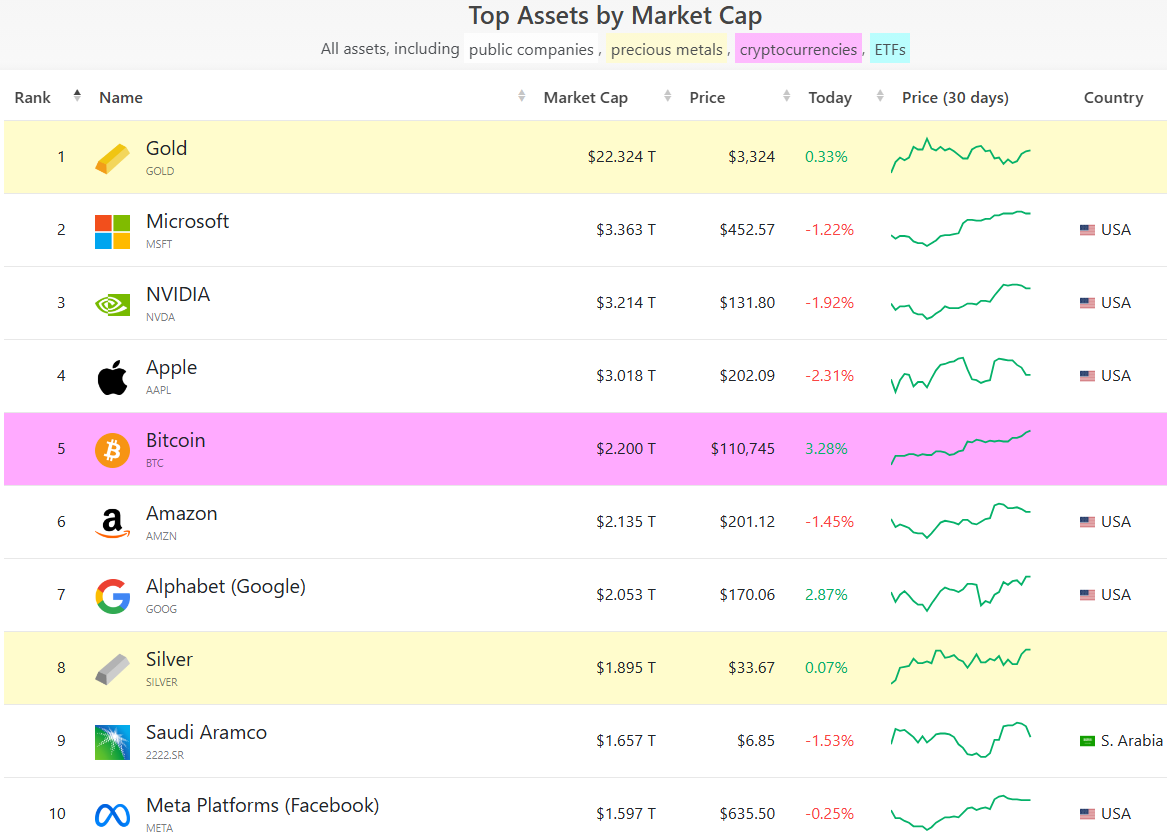 Зазначимо, що капіталізація біткоїна перевищила $2,200 трлн. На тлі зростання він став одним із найбільших за капіталізацією активів у світі, обігнавши компанію Amazon і посівши п’яту сходинку в загальному рейтингу.