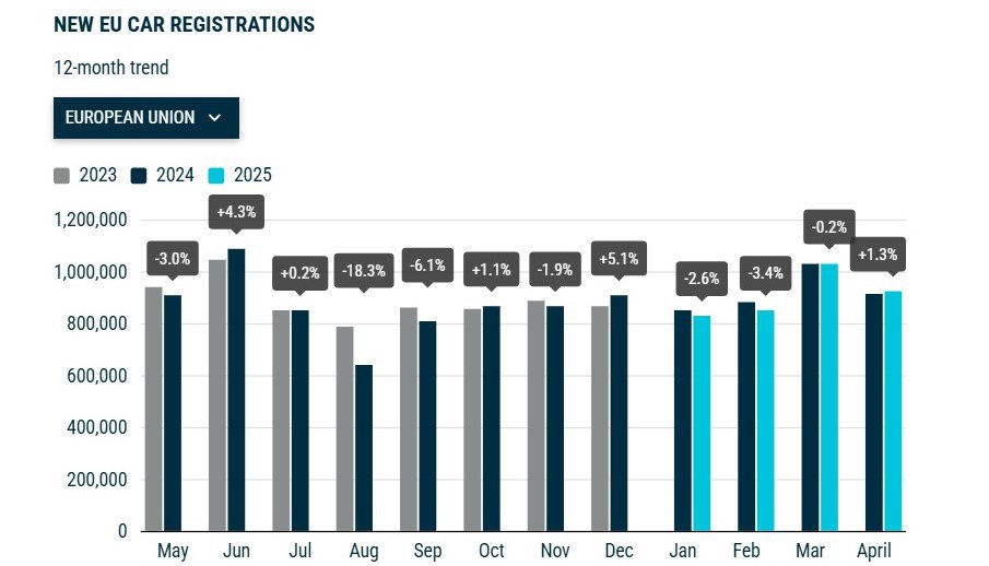 У квітні 2025 року кількість реєстрацій нових легкових авто в ЄС збільшилась в річному обчисленні на 1,3% — до 925 358 од. Про це свідчать дані Європейської асоціації автовиробників (ACEA), повідомляє Укравтопром.