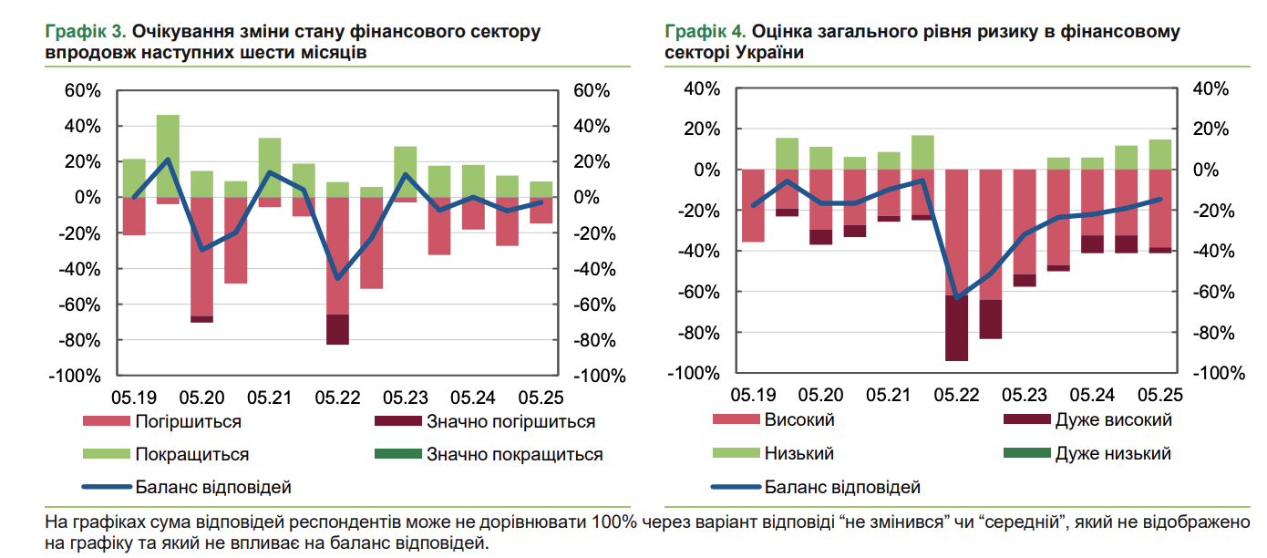 Більшість респондентів зазначила, що стан фінансового сектору за останніх шість місяців не змінився, а три чверті очікують, що його стан не зміниться й у наступні шість місяців.