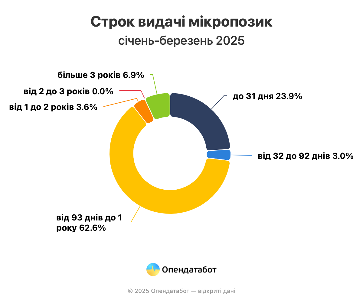 63% мікрокредитів беруть на термін від 93 днів до 1 року. Частка таких договорів майже не змінились. Водночас у 15 разів побільшало довгострокових мікропозик — від 1 до 2 років. Їх частка наразі складає 3,6%.