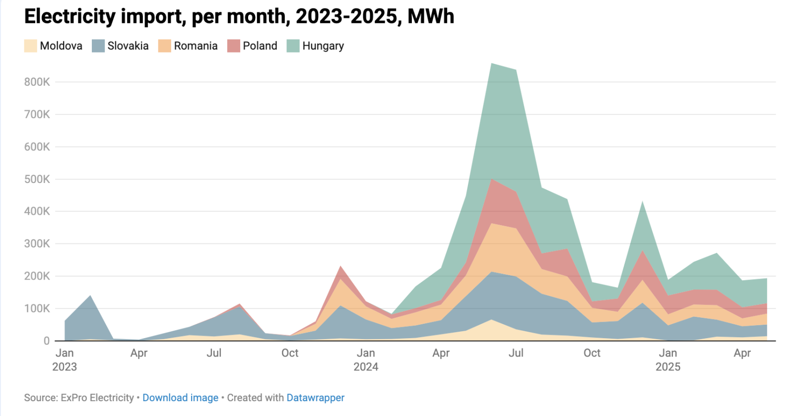 Імпорт електроенергії у травні 2025 р. зріс на 3,6%, у порівнянні з квітнем 2025 р. Найбільше виросли обсяги імпорту з Молдови та Словаччини, проте найбільшу частку і надалі займає угорський напрям, 40%.