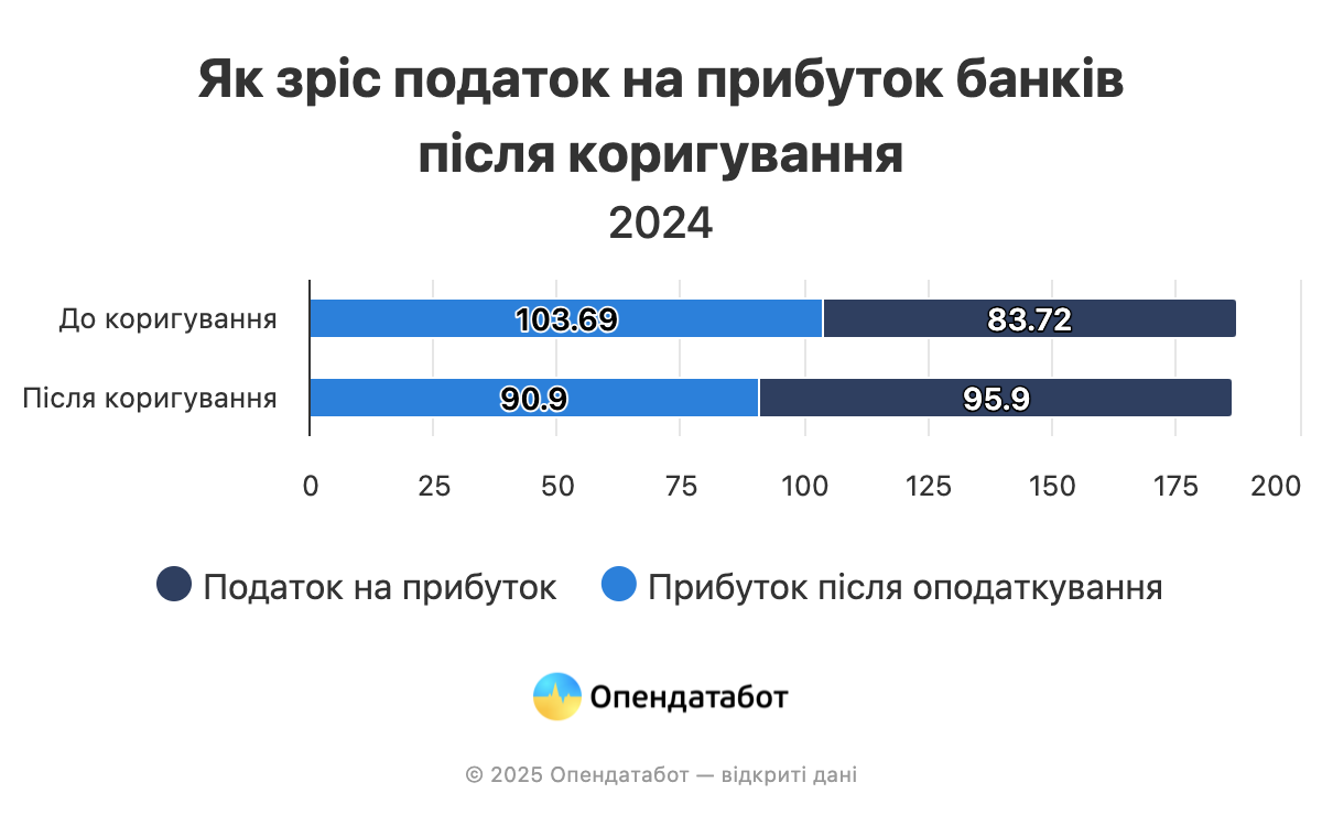 93% усіх донарахувань припало на державні банки — це 11,78 млрд грн додаткових податків. Найбільше сплатив Ощадбанк: податок на прибуток після коригування збільшився у 2,5 раза — з 4,3 до 10,66 млрд грн (+6,36 млрд грн).