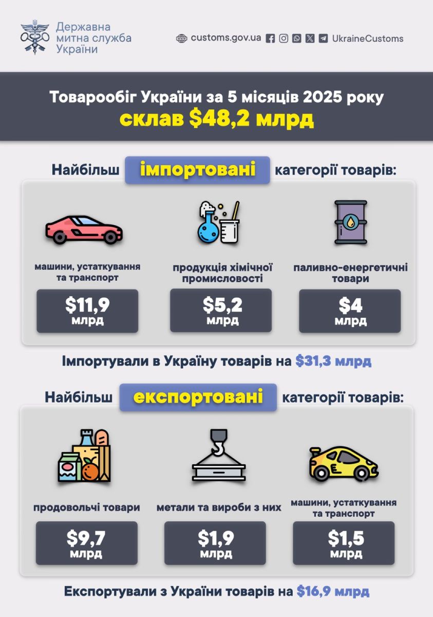 Протягом січня-травня 2025 року в Україну імпортували товарів на суму $31,3 млрд, а експортували — на $16,9 млрд. Про це повідомляє «Мінфін» з посиланням на Державну митну службу.