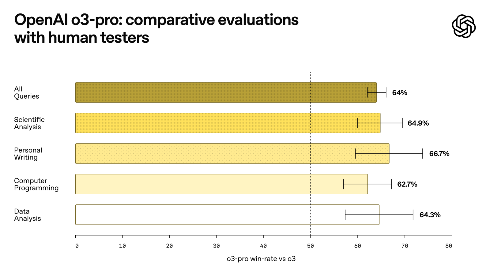 За інформацією від OpenAI, під час тестів експерти постійно віддавали перевагу o3-pro порівняно з попередньою моделлю o3. Це стосувалося всіх напрямків, включаючи науку, кодування, освіту, бізнес та створення текстів.